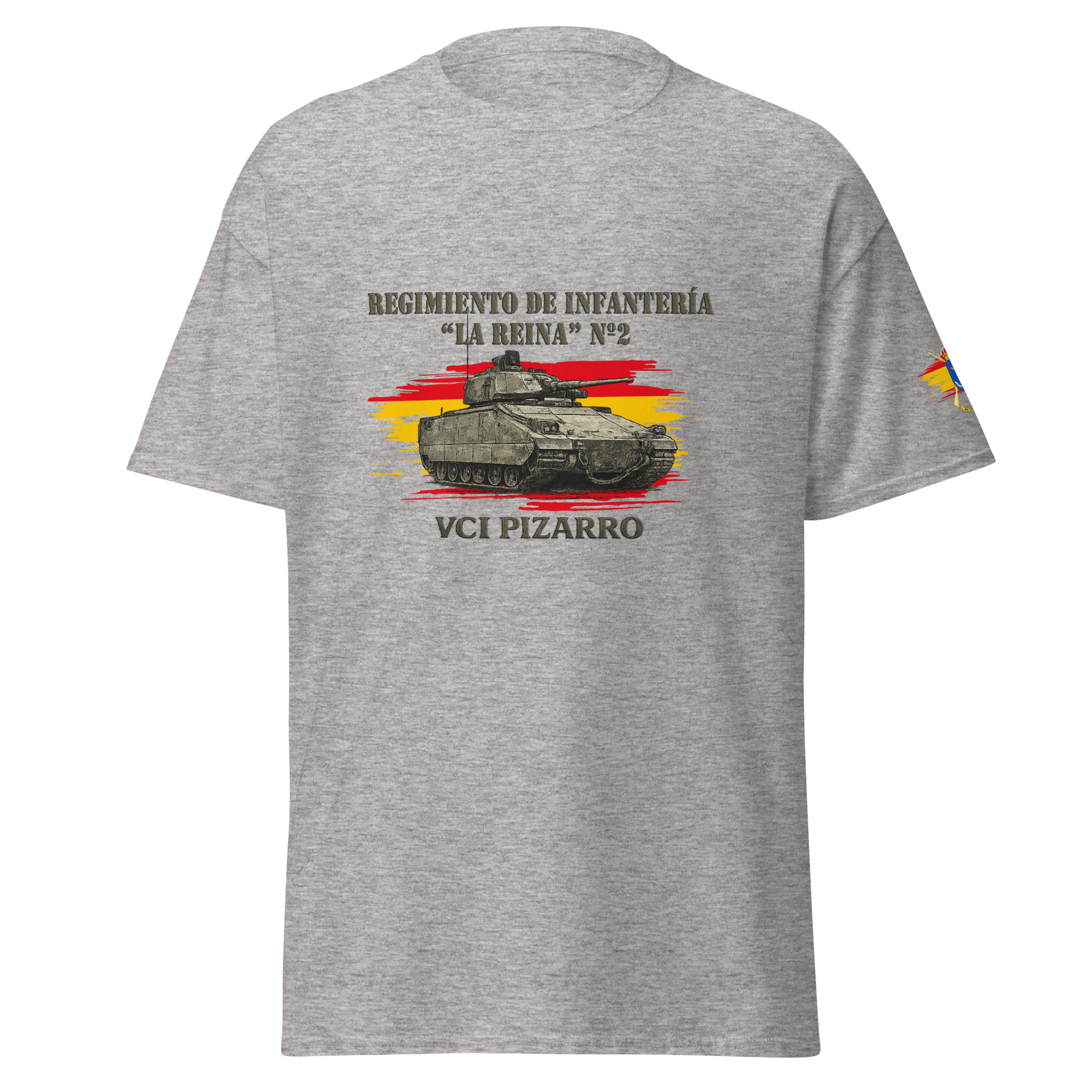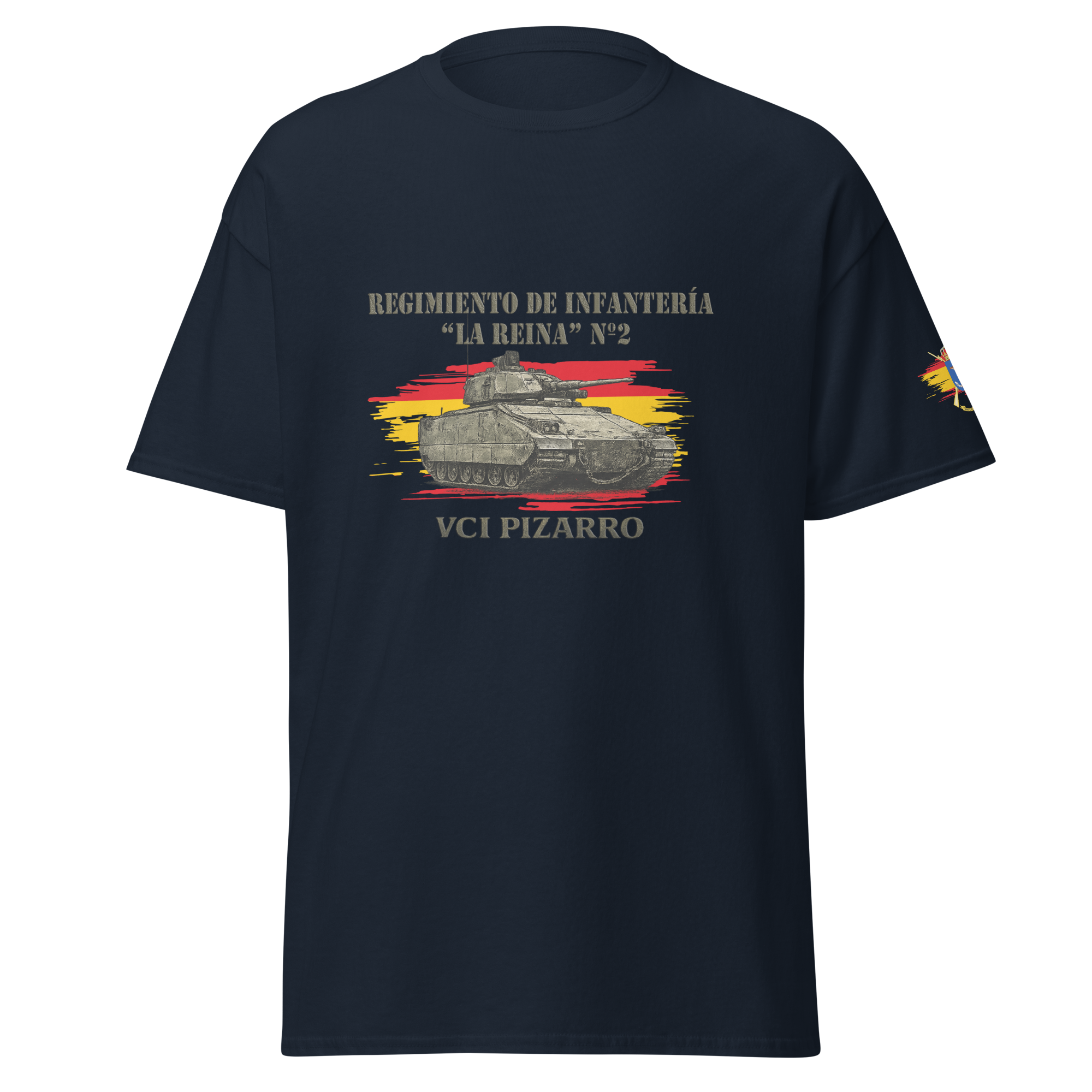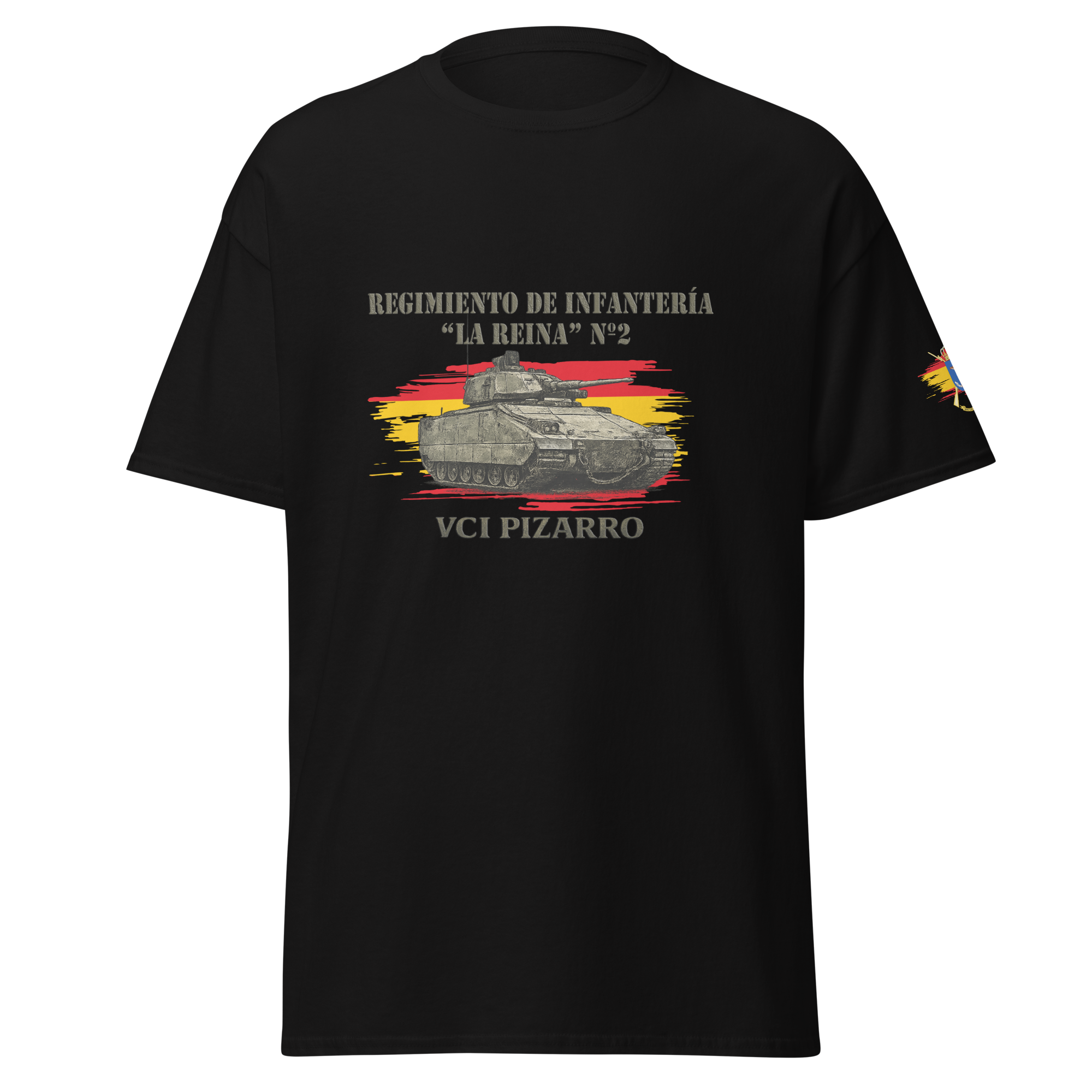Camiseta confeccionada en algodón 100% con ilustración frontal del VCI Pizarro, acompañada de la referencia al Regimiento de Infantería “La Reina” Nº2. Diseño claro y representativo del arma acorazada del Ejército de Tierra.