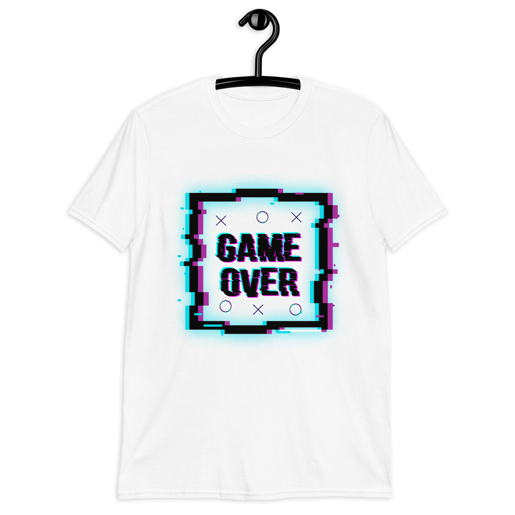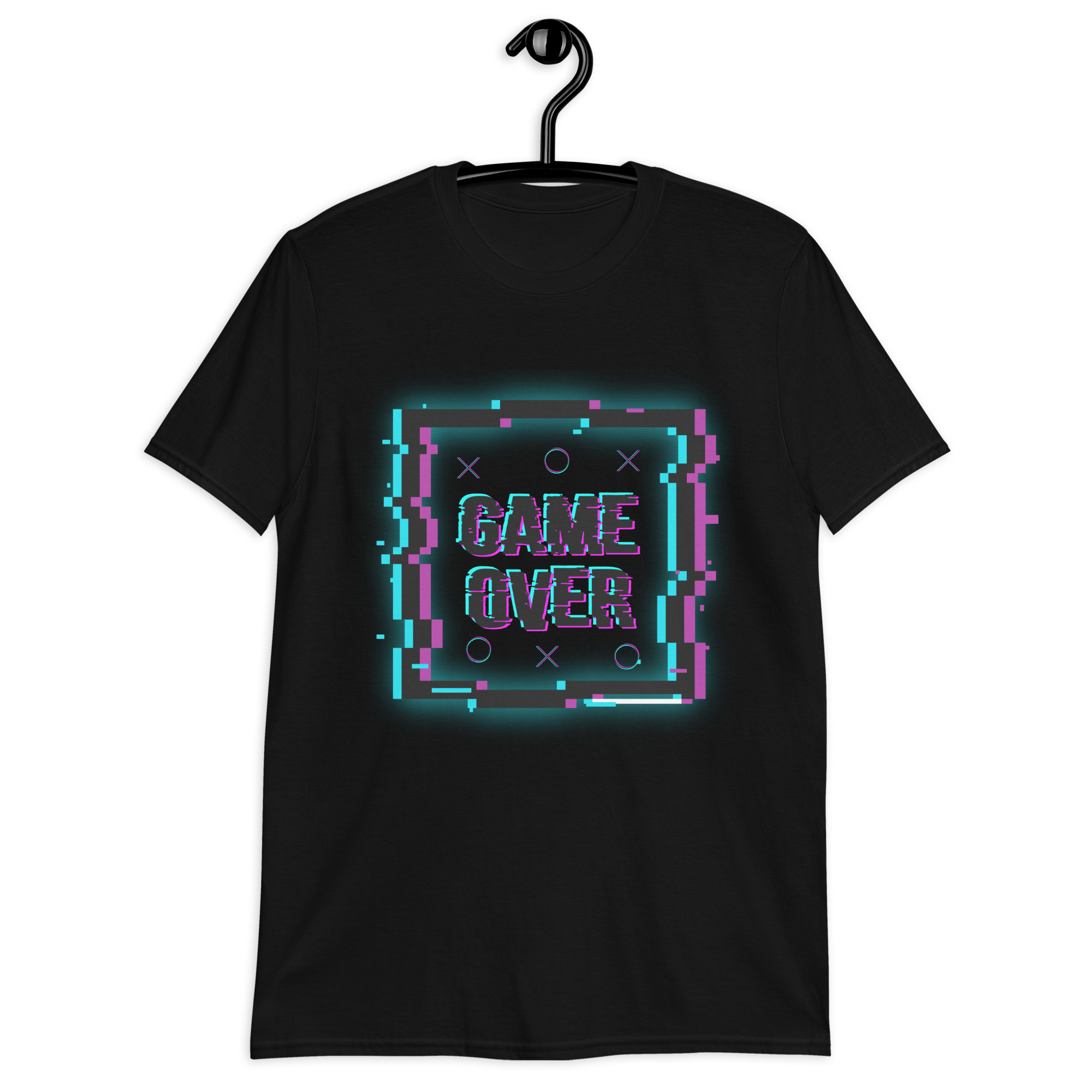 Revive los 80 con un diseño glitch que rinde homenaje a las pantallas arcade. “Game Over” en su versión más nostálgica, para los que crecieron jugando en recreativas.