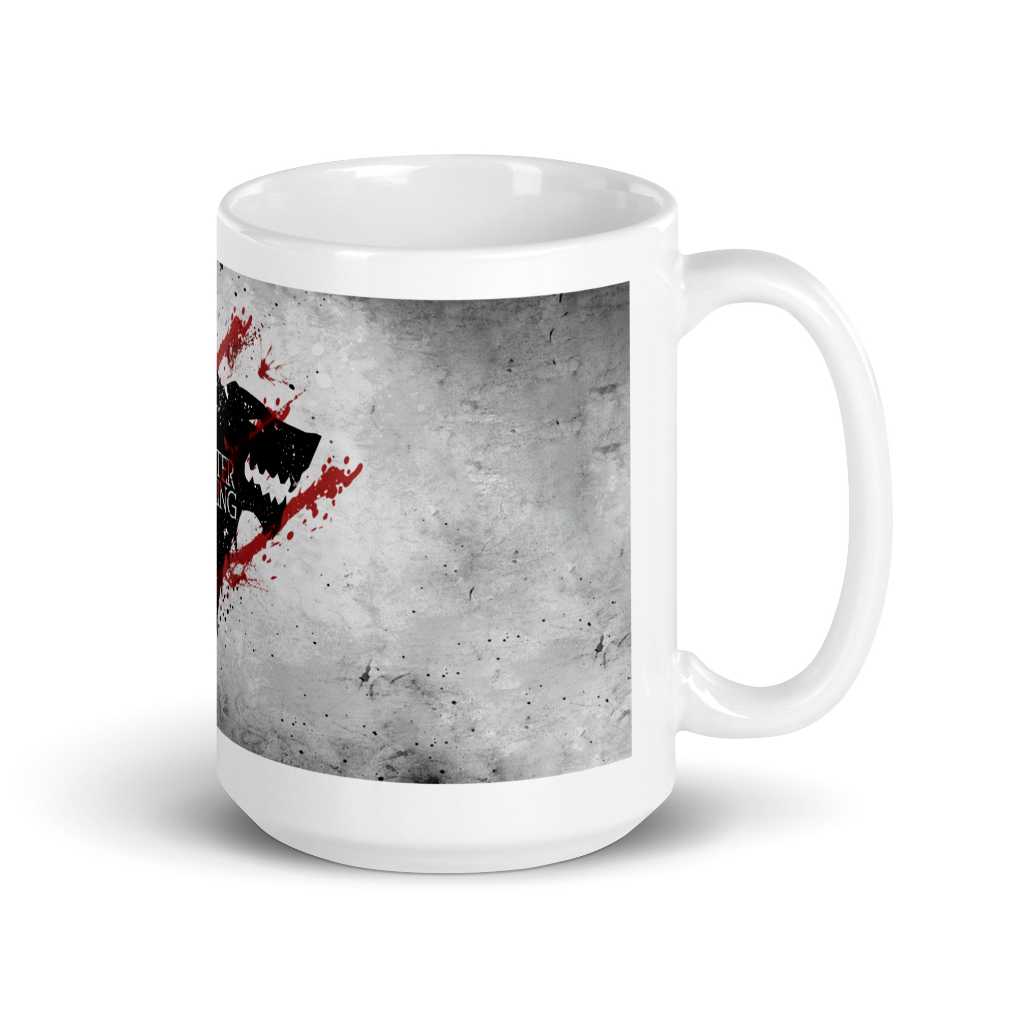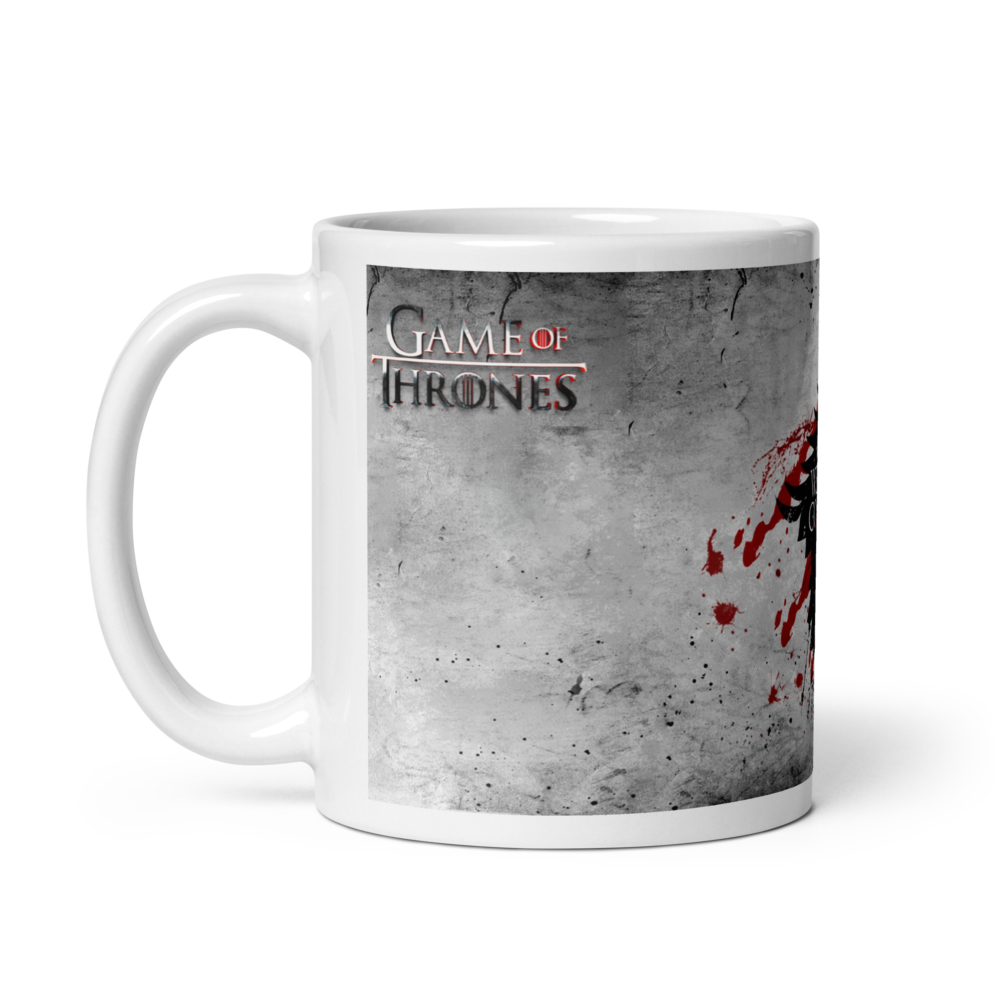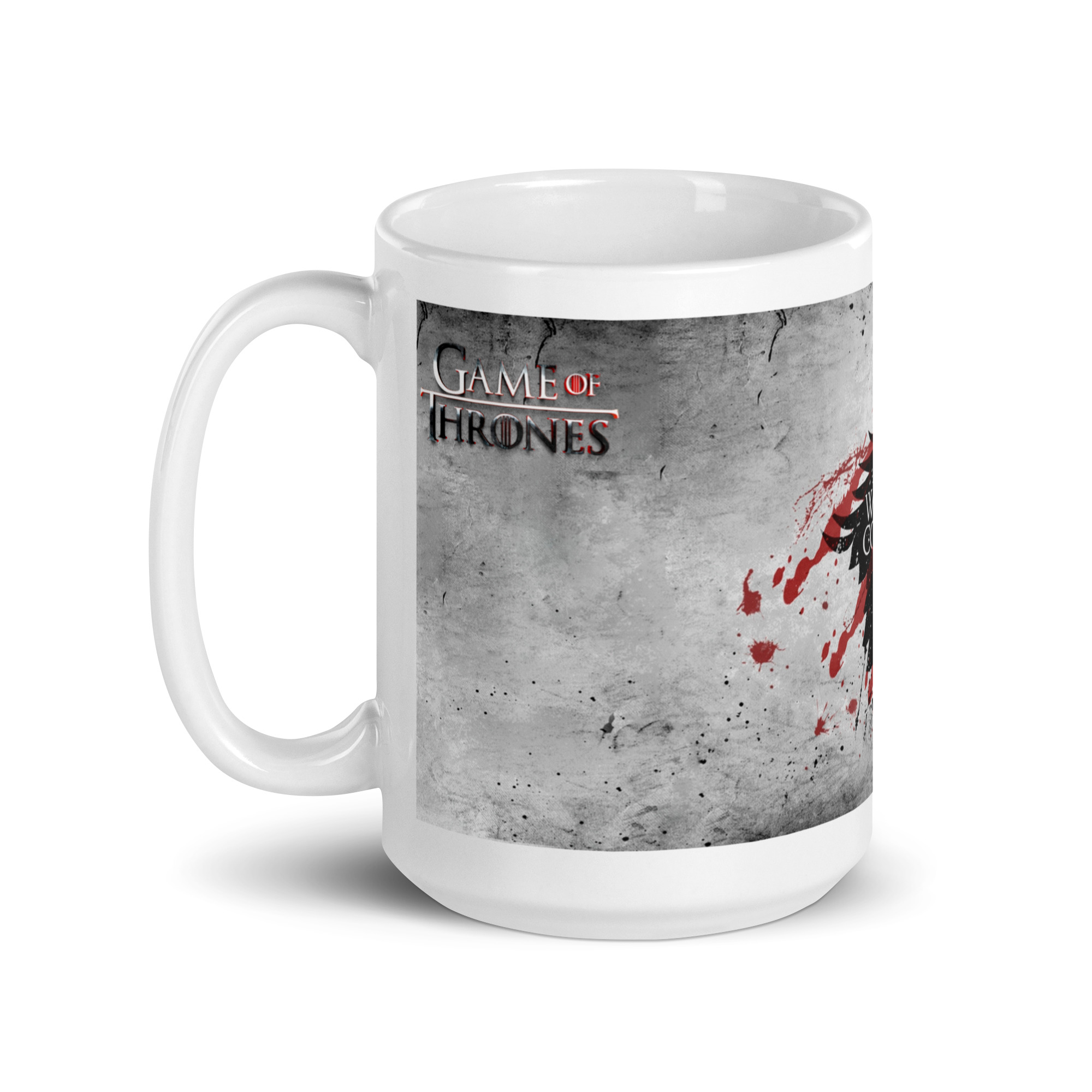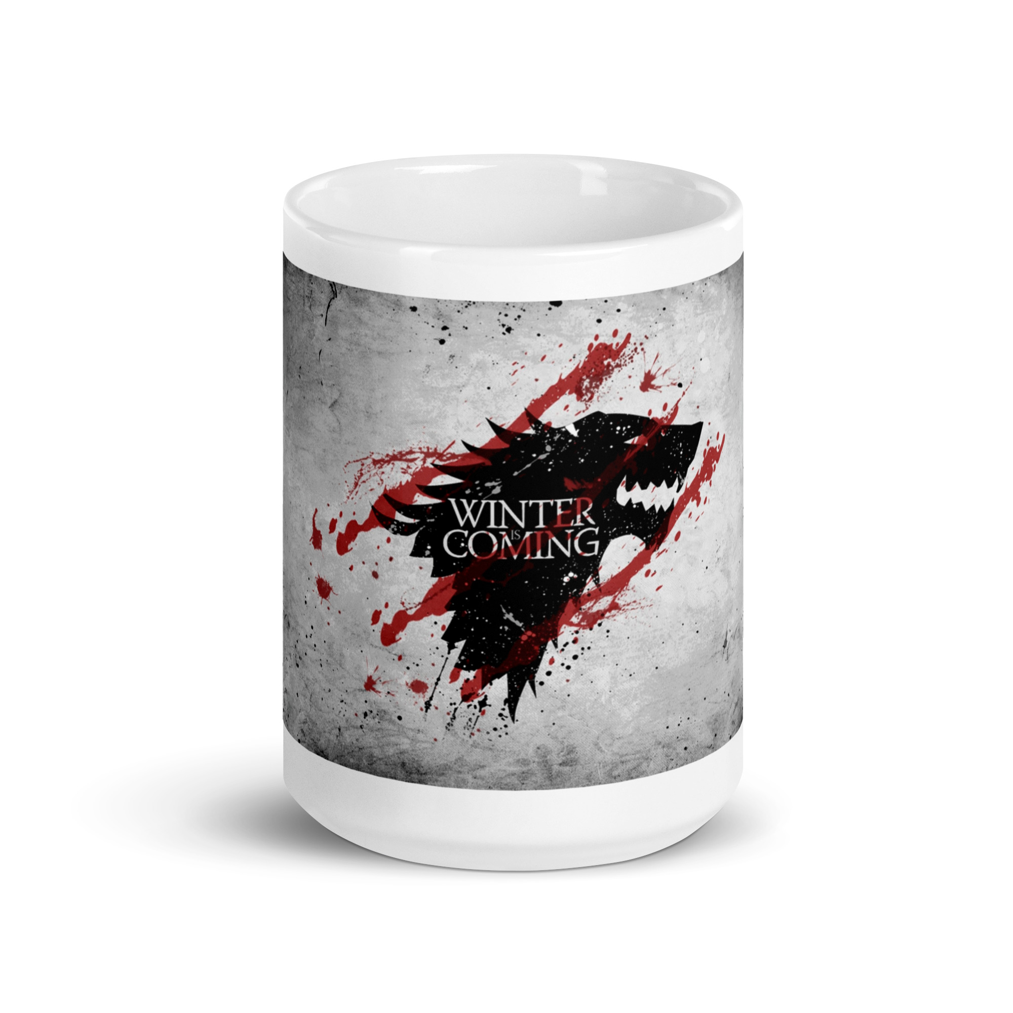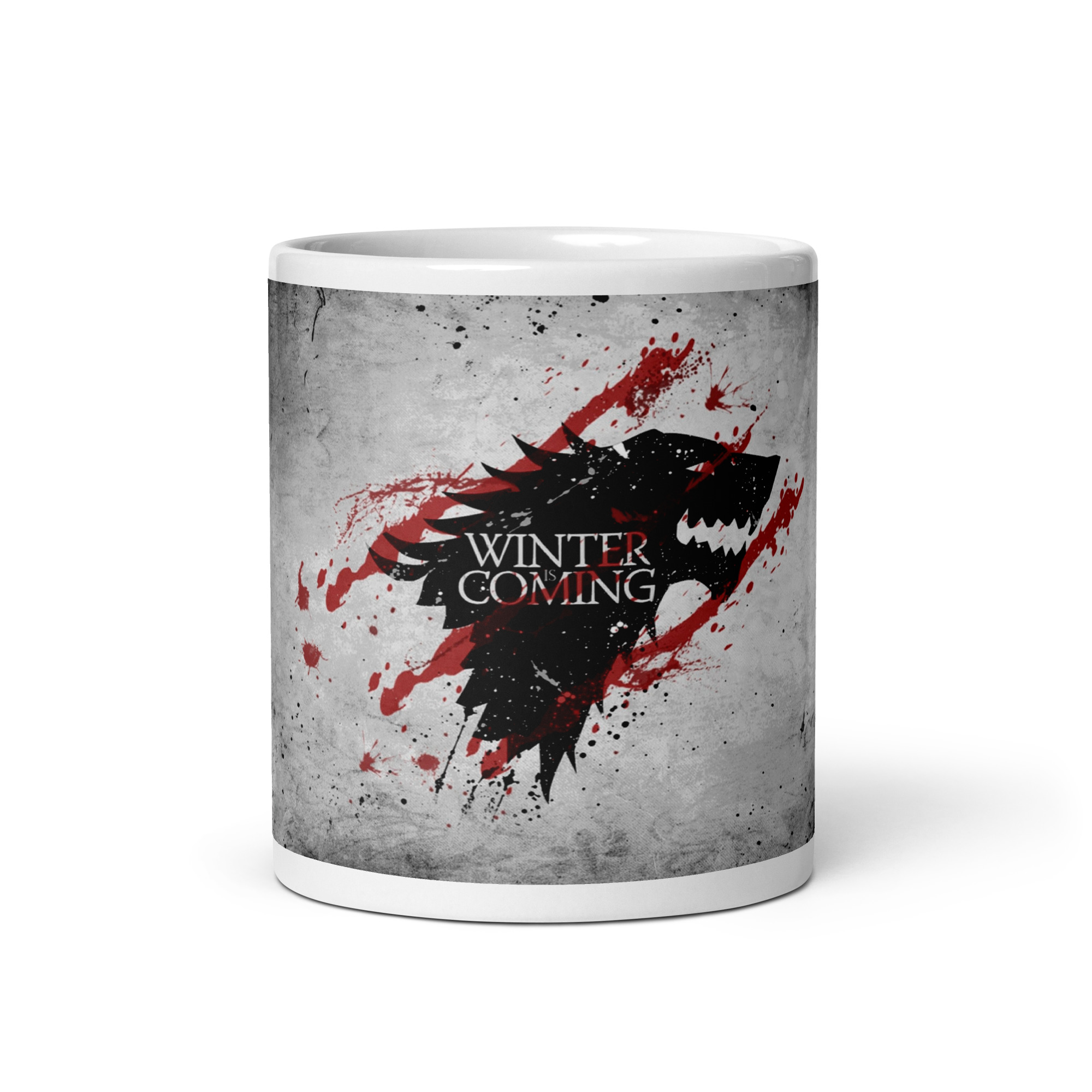 Fría, elegante y con fuerza. Esta taza inspirada en la Casa Stark de Invernalia combina la silueta del lobo huargo negro con el mítico lema “Winter Is Coming”, atravesado por tres líneas rojas que evocan sangre y batalla.